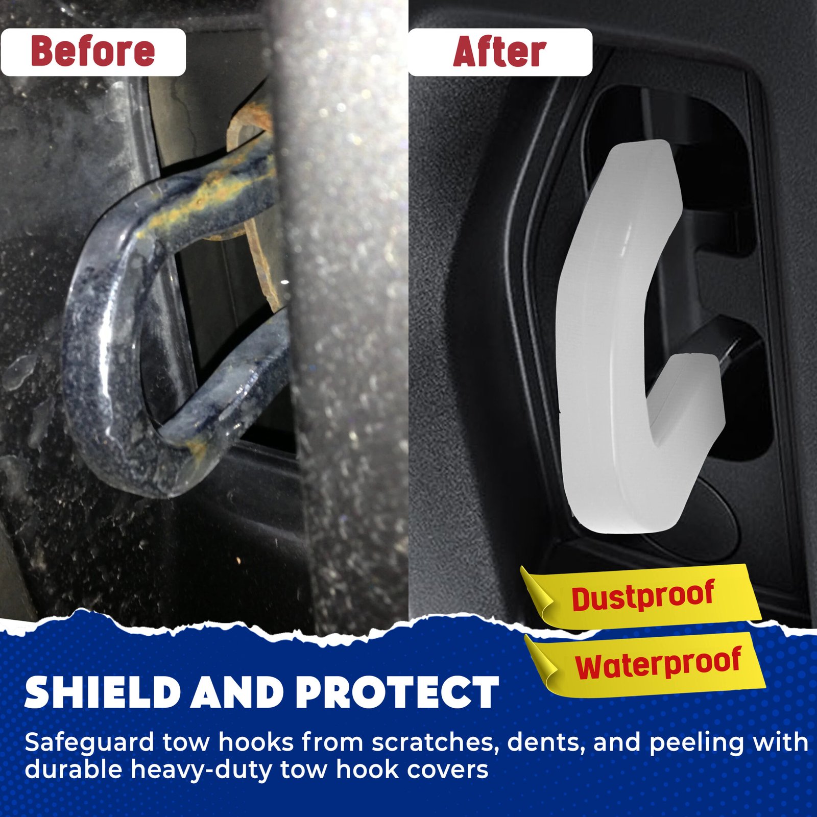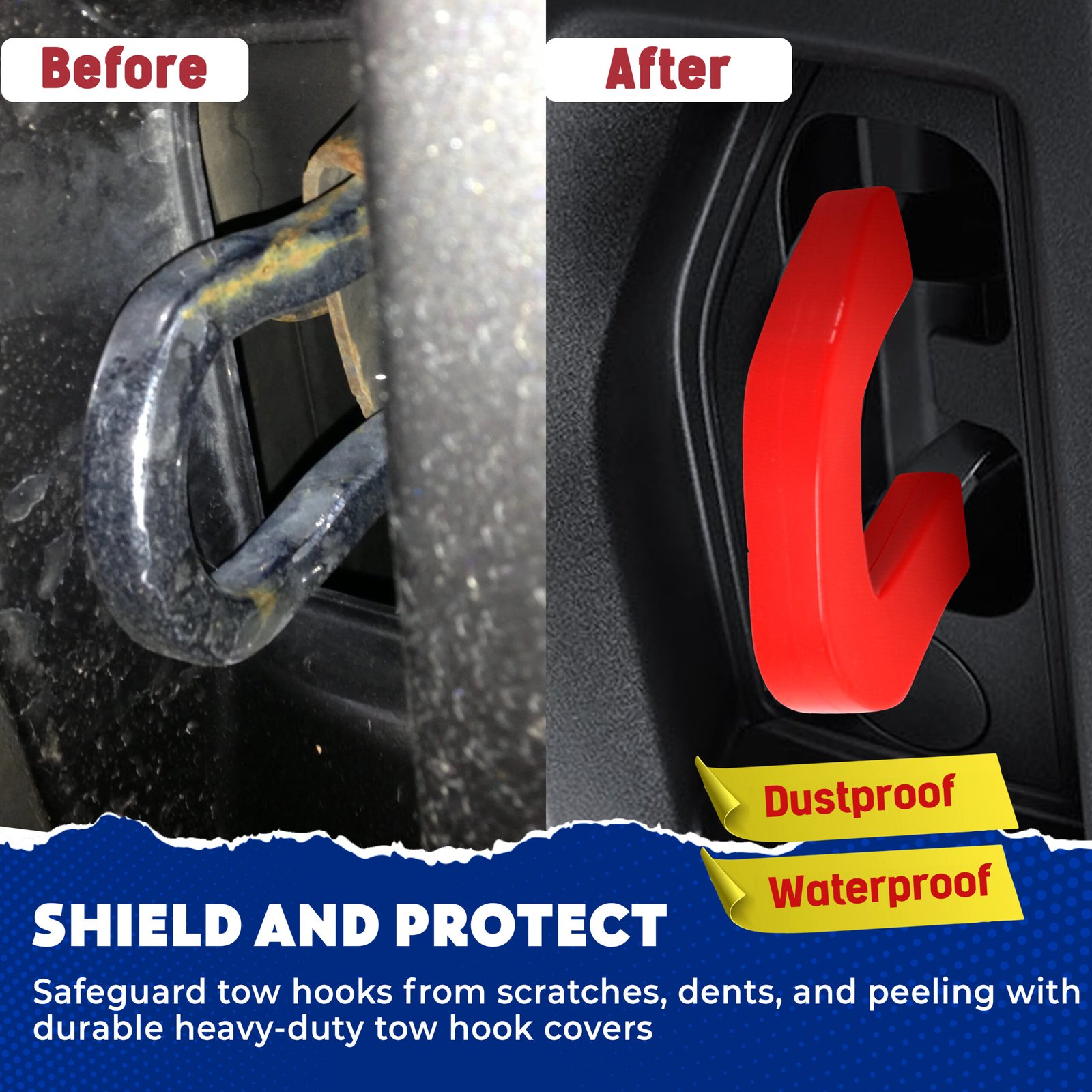 - 【Enhanced Protection】Constructed from premium silicone material, this tow hook cover is built to withstand a range of challenging road conditions. With an IP67 waterproof rating, it effectively protects the tow hook covers from scratches, dings, and potential paint peeling, ensuring durability against dust, dirt, water, and snow.